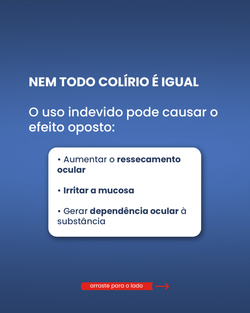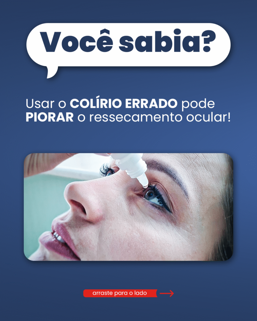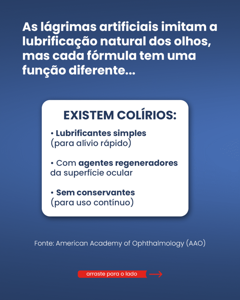 Existem lágrimas artificiais com e sem conservantes, com diferentes funções e indicações. Usar o produto errado pode agravar o ressecamento ocular.