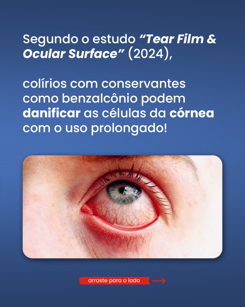 Segundo a American Academy of Ophthalmology, colírios com conservantes devem ser usados com cautela, especialmente por quem usa lentes de contato ou passa longos períodos em frente às telas.